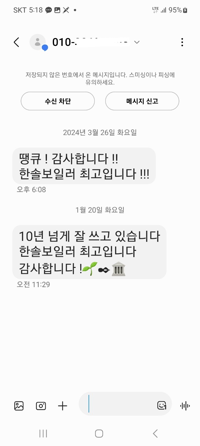 저희 보일러를 10년 넘게 사용하고 계신 고객님께서 보내주신 문자메시지 입니다. 페이지 정보 작성자 최고관리자 댓글 0건 조회 306회 작성일 26-02-02 17:07 목록 본문 저희 한솔보일러를 10년 넘게 사용하고 계신 고객님께서 문자메시지를 보내주셨습니다! 다음글한솔 화목 보일러 설치에 매우 만족합니다. - 2023년 1월 28일 요양원님께서 올려주신 사용후기 입니다. 23.04.17 댓글 0 댓글목록 등록된 댓글이 없습니다.